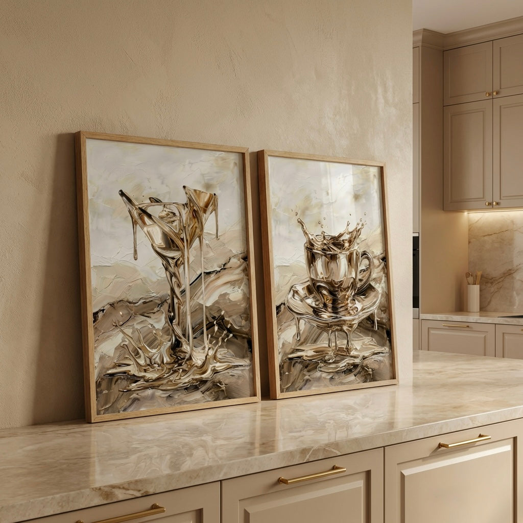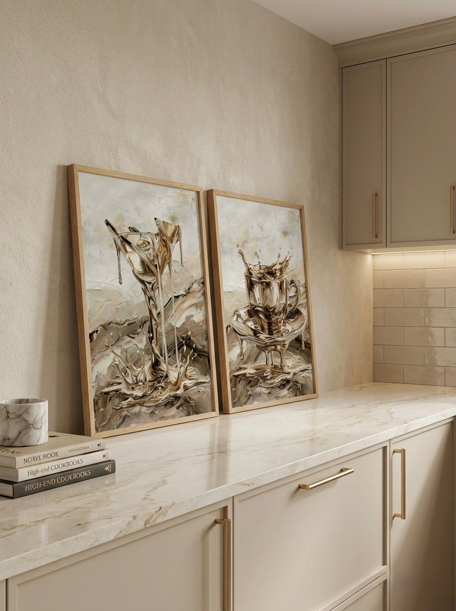 A cup of coffee takes centre stage, swirling and rising through layers of beige and caramel impasto, capturing the rich depth and soothing ritual of every brew.