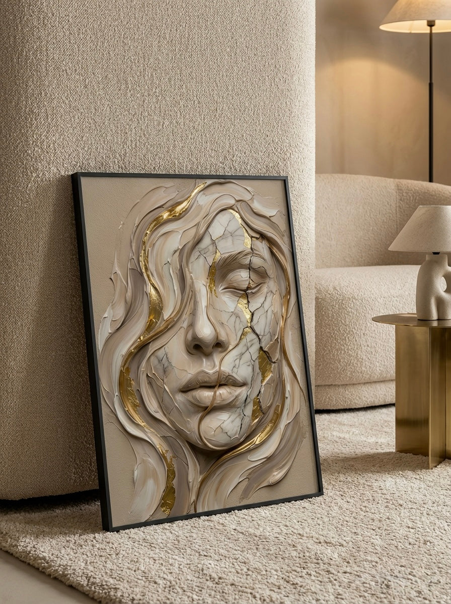 Timeless beauty meets quiet decay in this sculptural vision. A marble-like face emerges in soft beige and gold tones, its surface fractured with delicate cracks that tell a story of strength beneath stillness.