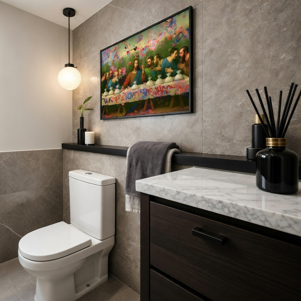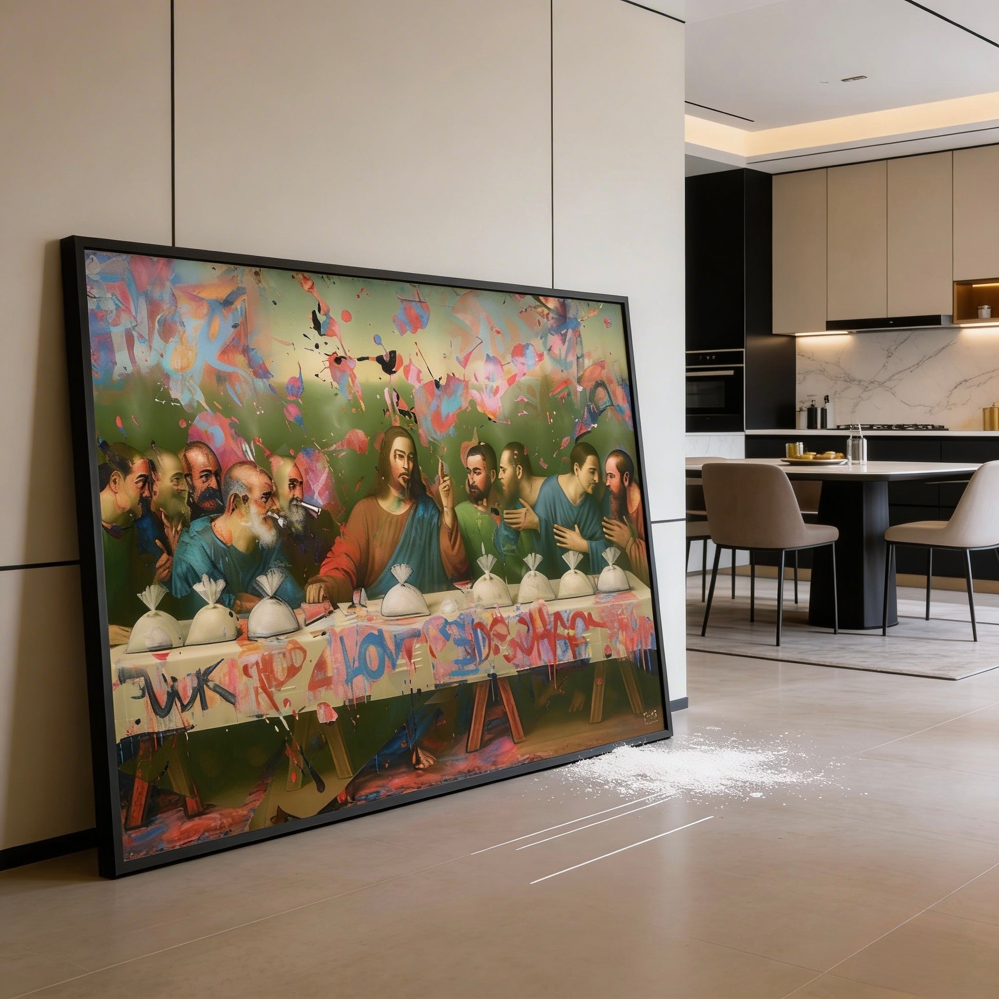 A bold reimagining of a classic supper scene, splashed with graffiti and stacked with mysterious bags of sugar across the table. Sacred tradition collides with modern street culture, turning an iconic moment into a provocative, surreal statement piece.